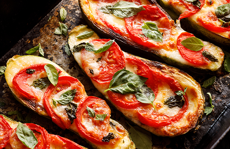 Ingredience: cuketa, rajčata, mozzarella, olivový olej, bazalka