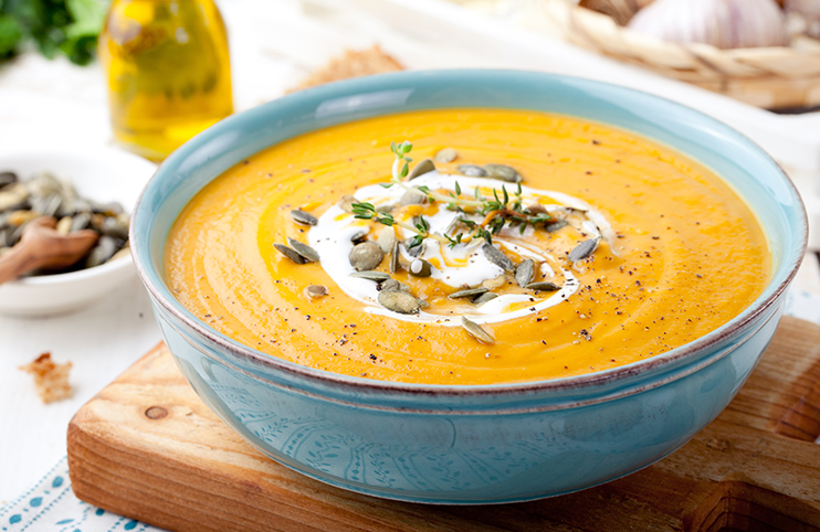 Ingredience: dýně, mrkev, cibule, smetana, dýňová semínka